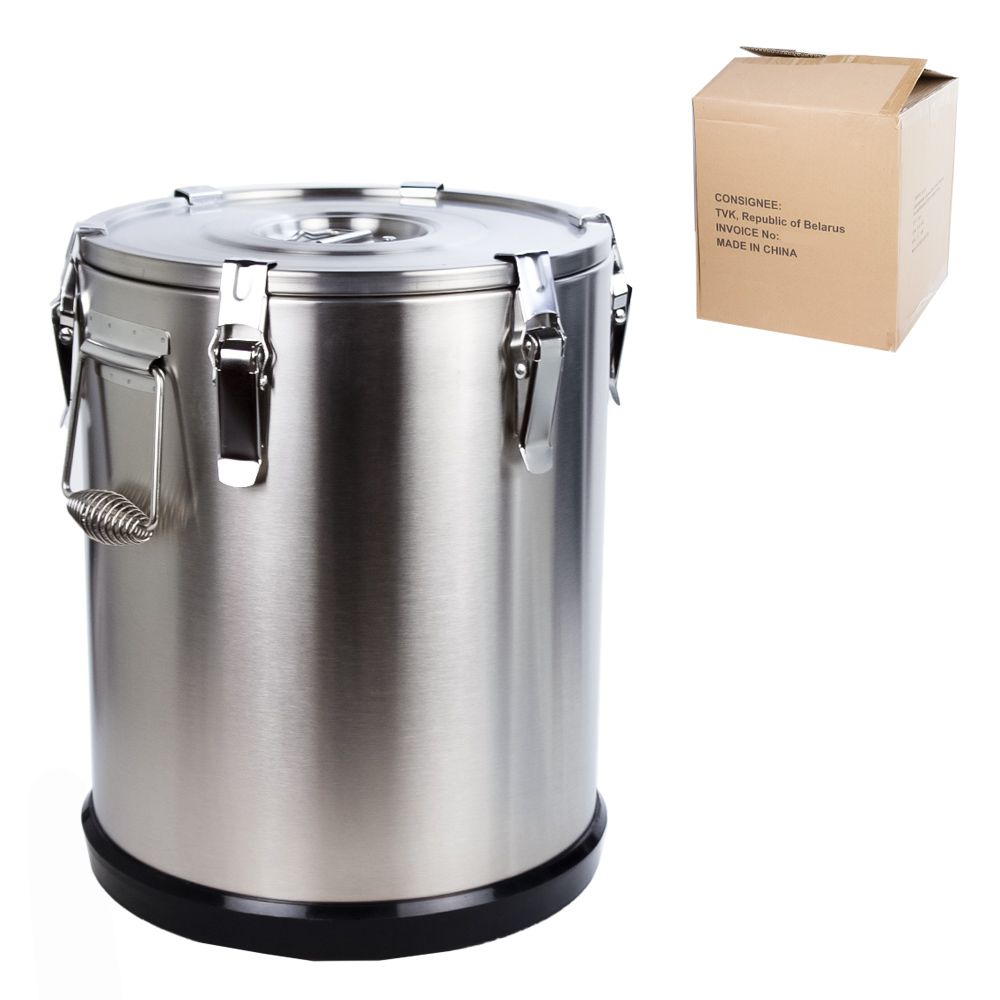 Большой термос для сохранения температуры пищевых продуктов при транспортировке. В том числе можно использовать для супов и горячих напитков. Предназначен для кейтеринговых компаний и предприятий общественного питания. Сохраняет температуру содержимого до 6 часов. Снаружи контейнер и крышка изготовлены из нержавеющей стали толщиной 0,7 мм . Оснащен двумя эргономичными изолированными ручками, каждая из которых закреплена семью сварными швами. Изолированная крышка оснащена ручкой и клапаном выпуска воздуха для легкого открытия. Крышка надежно закрыта 6 защелками. Снизу, оснащенному черным резиновым ободом, это защищает контейнер и позволяет укладывать несколько контейнеров друг на друга.