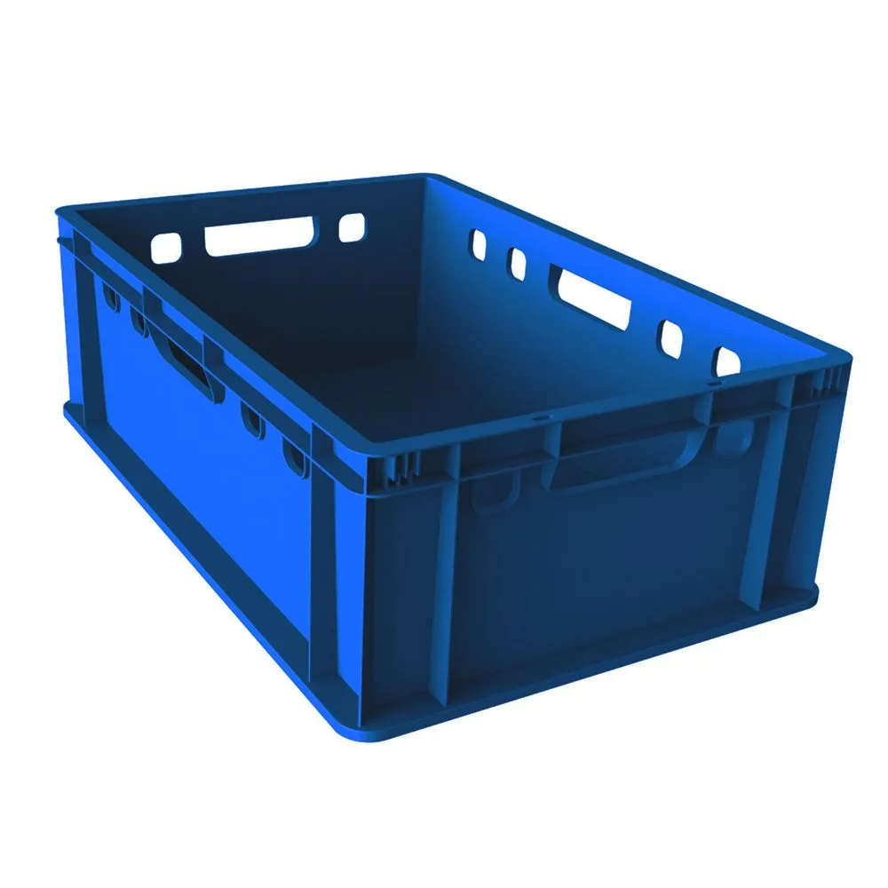 Универсальный штабелируемый ящик Е2 в сплошном исполнении стенок и дна со специальными отверстиями в верхней части корпуса для лёгкого проникновения охлажденного воздуха к поверхности заложенных в него мясных продуктов для консервации их холодом.