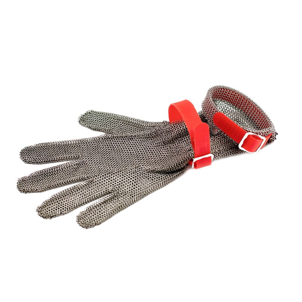 Перчатка выполнена из плетёной нержавеющей проволоки, предназначенная для защиты кисти руки от кухонного или обвалочного ножа, применяемая в пищевой промышленности и др. Диаметр колец 3,81 мм, толщина прута 0,53 мм. На запястье закрепляется пластиковым ремешком. Размер перчатки «отображается» цветом ремешка:
