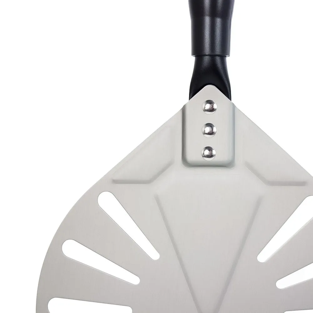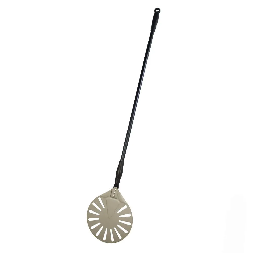 Перфорированная лопата для пиццы из анодированного алюминия с черной алюминиевой ручкой.