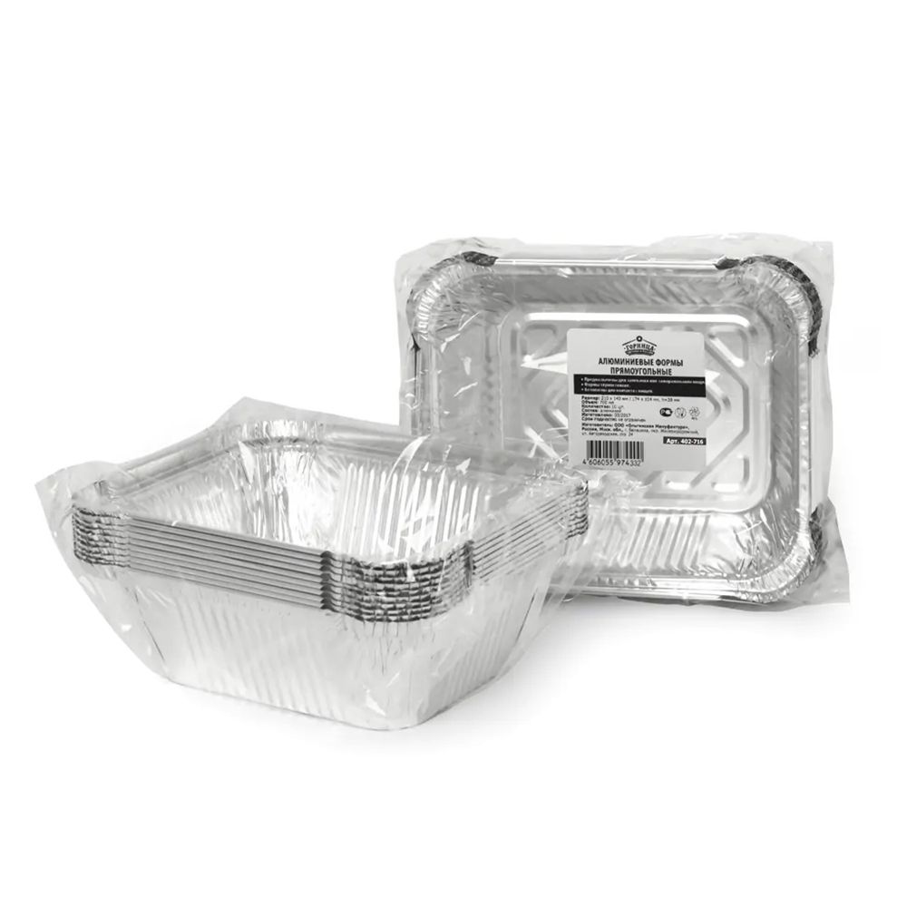 Алюминиевые прямоугольные формы для запекания: верх 150х124мм, дно 107х81мм; глубина 44мм, объем 490мл, 10 шт. в упаковке