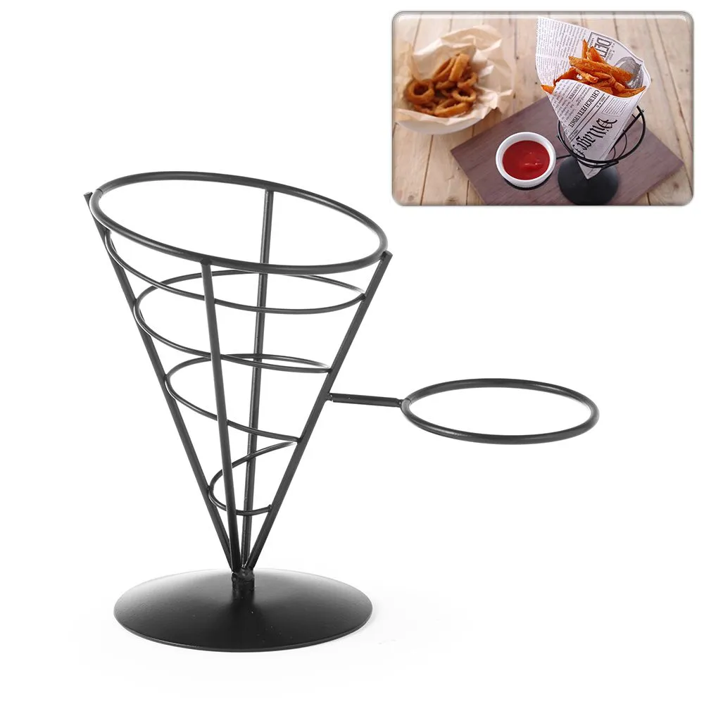 Черная проволочная подставка с держателем для соусов отлично подходит для подачи картофеля-фри и других снэков.