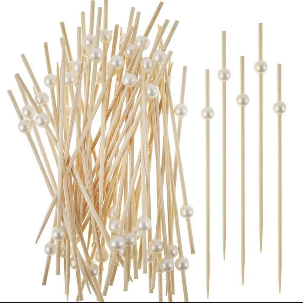 Шпажки для канапе изготовлены из дерева (бамбук). Бусина изготовлена из пластика, цвет белый.